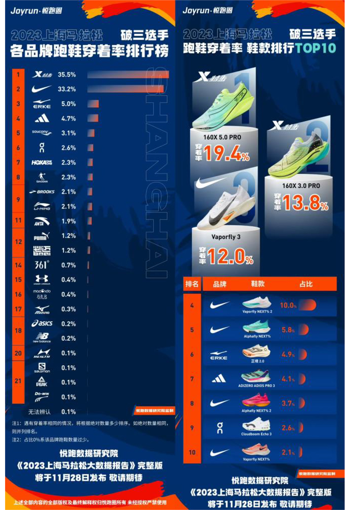 According to the statistics released by the race organizing committee, a total of 1,164 athletes finished the race within three hours at this year's Shanghai Marathon. According to the 2023 Shanghai Marathon Data Report published by Joyrun, Xtep achieved the top position with a 35.5% wear rate among sub-3 hour athletes at the 2023 Shanghai Marathon. Among them, Xtep's ‘‘160X 5.0 PRO’’ and ‘‘160X 3.0 PRO’’ accounted for 19.4% and 13.8%, respectively, ranking first and second in the wear rate among sub-3 hour runners.