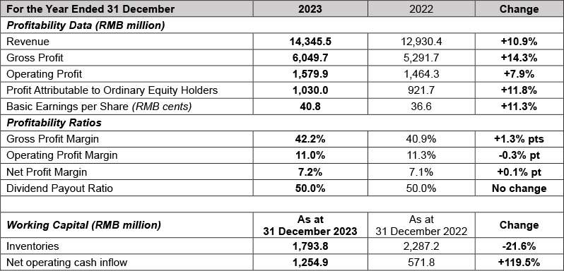 The Group’s gross profit margin lifted to 42.2% (2022: 40.9%), with the operating profit registering an increase of 7.9% to RMB1,579.9 million (2022: RMB1,464.3 million). Profit attributable to ordinary equity holders of the Company also hit an all-time high of RMB1,030.0 million (2022: RMB921.7 million), an increase of 11.8%. Basic earnings per Share was RMB40.8 cents (2022: RMB36.6 cents). The Group’s working capital demonstrated strong efficiency. Inventories of the Group remarkably declined by 21.6% to RMB1,793.8 million (2022: RMB2,287.2 million), with net operating cash inflow surged by 119.5% to RMB1,254.9 million (2022: RMB 571.8 million).