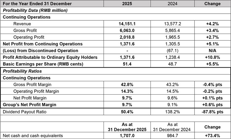 In 2025, the Group’s revenue from continuing operations rose 4.2% to RMB14,151.1 million with gross profit margin at 42.8%. Revenue of the core Xtep brand increased by 1.5% to RMB12,515.1 million. Revenue of the professional sports segment climbed by 30.8% to RMB1,636.0 million. Revenue of the overseas business nearly doubled, with cross-border e-commerce delivering over 220% growth, fueled by robust performance across key Southeast Asian platforms. Operating profit of the Group’s continuing operations grew to RMB2,018.8 million. Including a loss of RMB67.1 million from the discontinued operation (K·SWISS and Palladium) in 2024, profit attributable to ordinary equity holders of the Company reached RMB1,371.6 million, representing an increase of 10.8%. Basic earnings per Share stood at RMB51.4 cents. The Board has proposed a final dividend of HK9.5 cents per Share, with the option to receive scrip shares in lieu of cash. Together with an interim dividend of HK18.0 cents per Share, the full-year dividend payout ratio equates to 50.4%. Since its listing, the Group has maintained a dividend payout ratio of no less than 50% for 18 consecutive years, demonstrating its unwavering commitment to delivering long-term shareholder value.